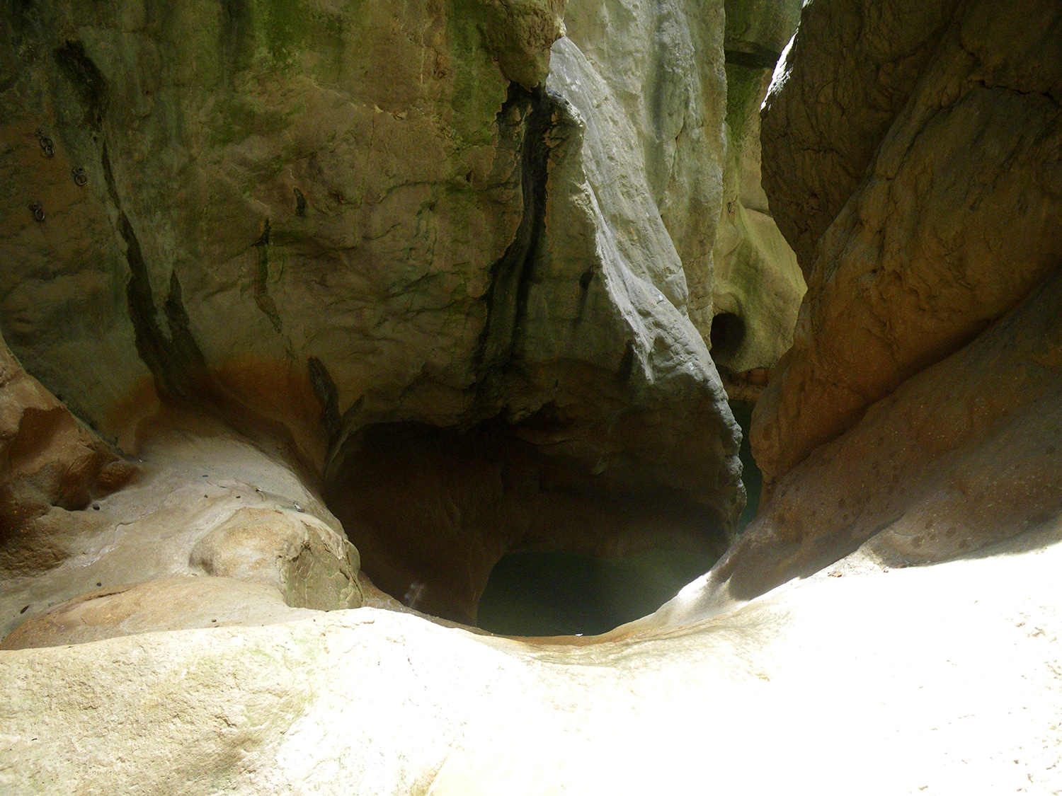 Passé la confluence avec le barranco du Raisen, nous arrivons dans une grotte sombre suivie d’un défilé flanqué de hautes parois où on alterne, marche et nage.