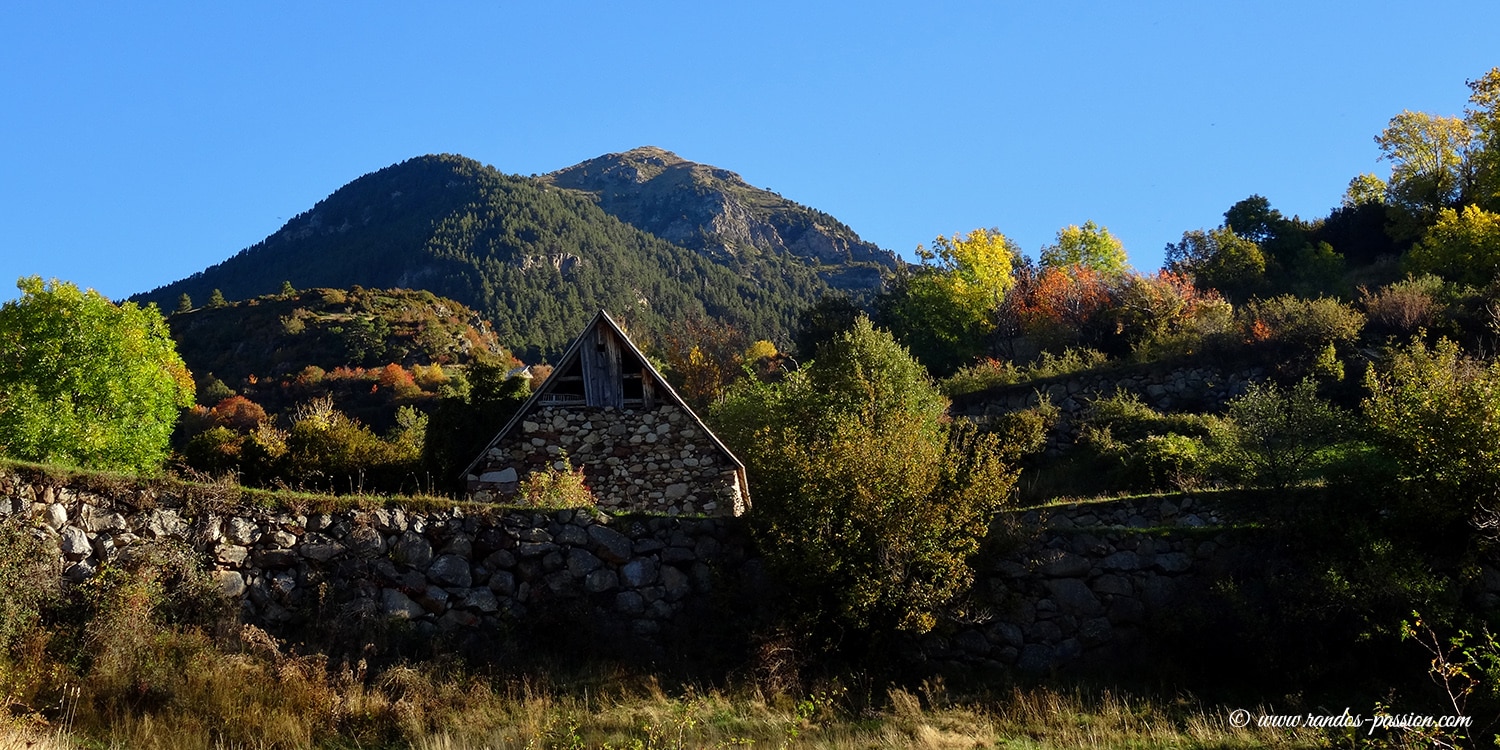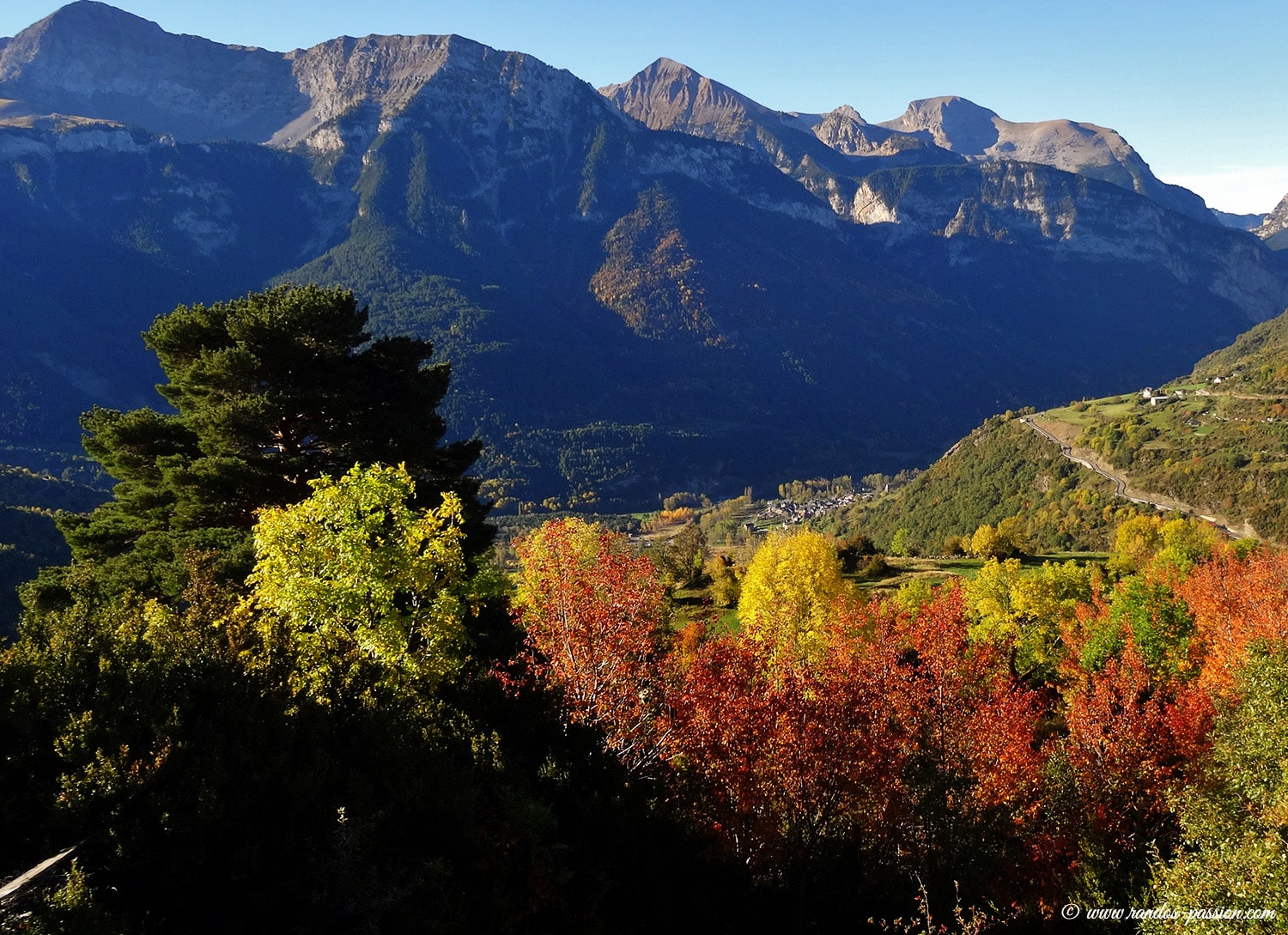 Le sentier monte à travers une belle forêt mixte où nous trouvons chênes, trembles, merisiers, peupliers, érables… dont les magnifiques couleurs d’automne zèbrent le ciel de flammes ocre et jaunes, contrastant avec le vert des prairies. Nous arrivons sur une zone de terrasses cultivé et occupé par de nombreuses granges d’altitude, avec en toile le fond le massif du Cotiella. Les vues sont à couper le souffle: c’est magnifique !