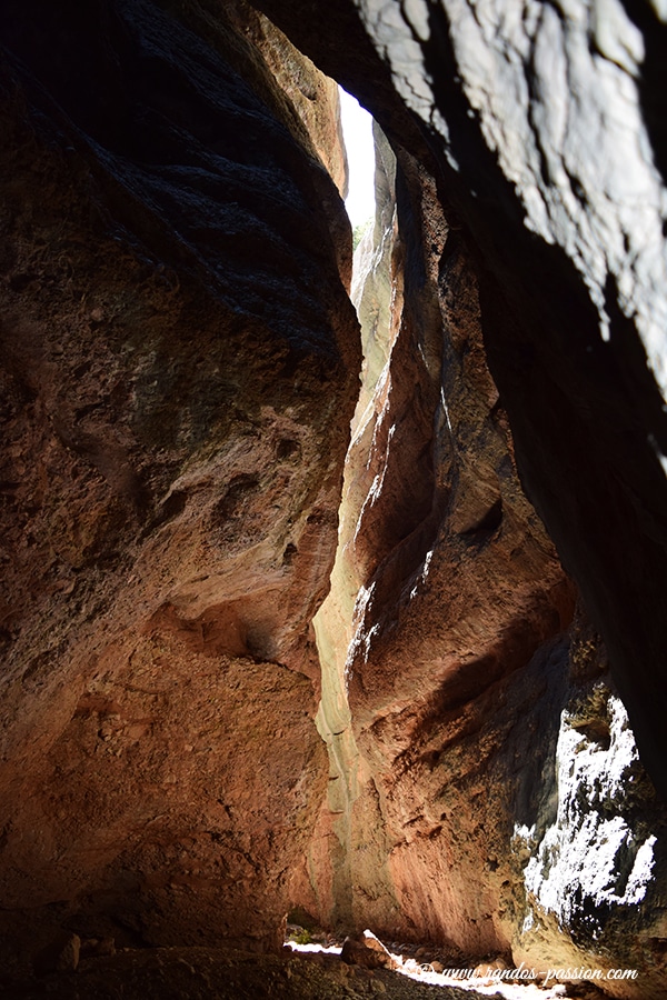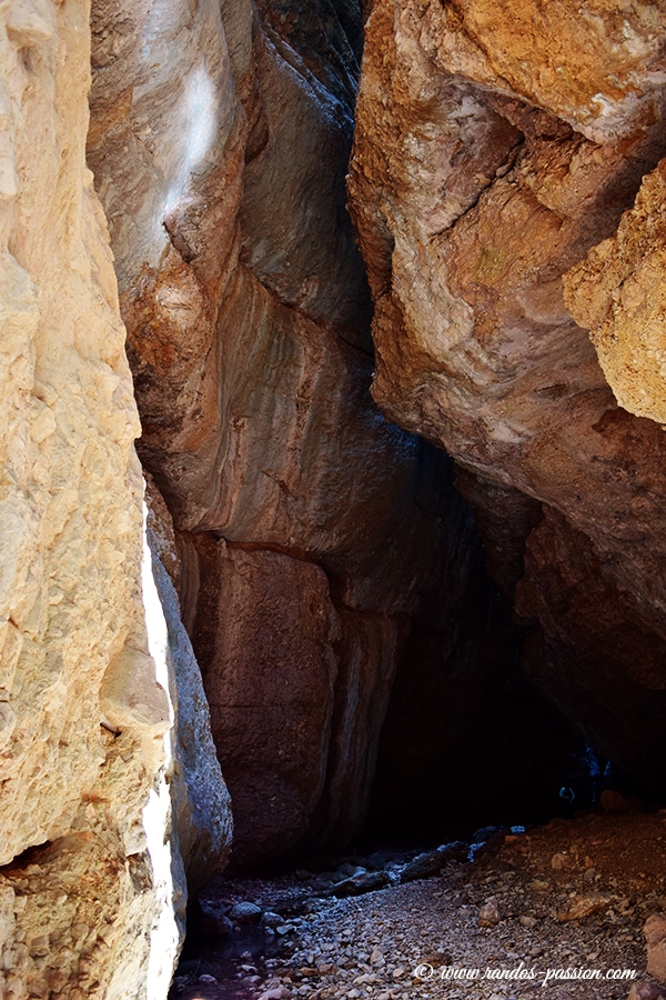 Nous poursuivons la marche vers le fond du barranco. On s’approche de la zone la plus étroite et la plus impressionnante de la gorge. Le sentier se rétrécit, entre les hautes falaises qui l’entourent. Le passage est tellement fermé que peu de lumière y pénètre. En écartant les bras, nous pouvons presque toucher les deux côtés de cet « estrecho ».