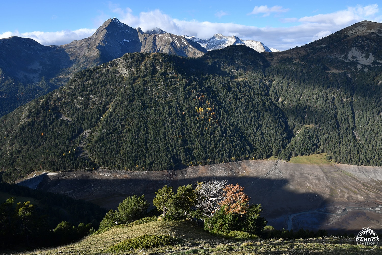 Lorsque nous arrivons en surplomb du lac de l’Oule, le GR 10 s’oriente brusquement plein nord en balcon, offrant une vue spectaculaire sur le lac. Sauf qu’aujourd’hui, surprise… il est totalement vide ! Le lac de l’Oule, créé dans les années 1910, est habituellement un magnifique miroir d’eau, mais les travaux de rénovation de son barrage l’ont transformé en une vaste étendue asséchée. Ce barrage, qui fait partie du réseau hydroélectrique de la vallée d’Aure, joue un rôle clé dans la production d’électricité et la gestion des ressources en eau. Mais en ce moment, il évoque davantage une plage à marée basse qu’un paisible lac de montagne !