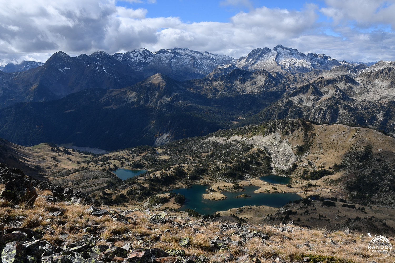 On se retourne pour souffler dans la dernière pente avant d’atteindre le col de Bastan… et là, waouh !! Quelle vue grandiose ! Les lacs de Bastan scintillent en contrebas, encadrés par les sommets enneigés.